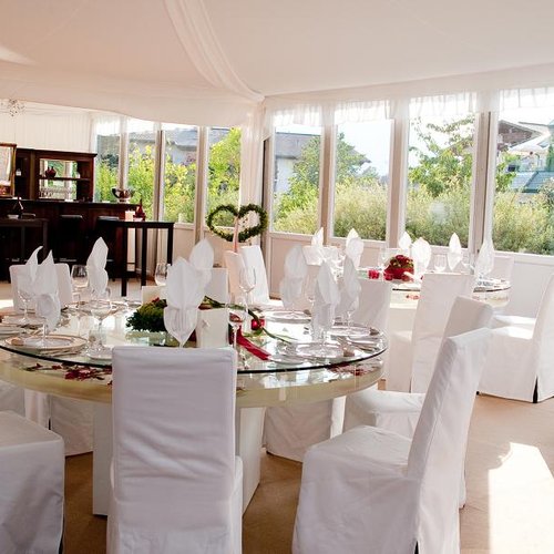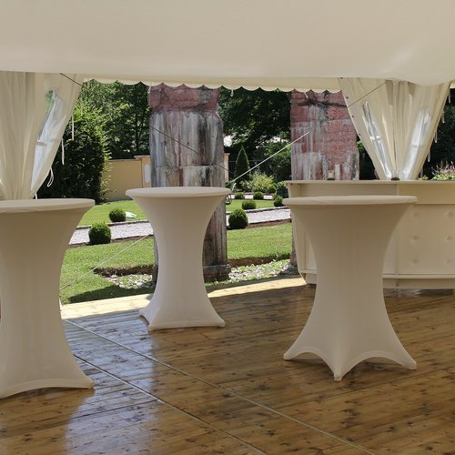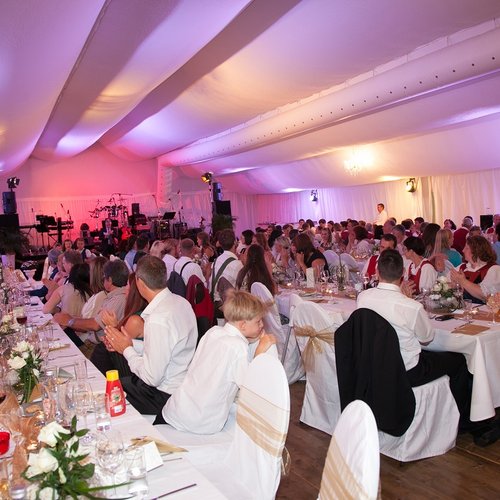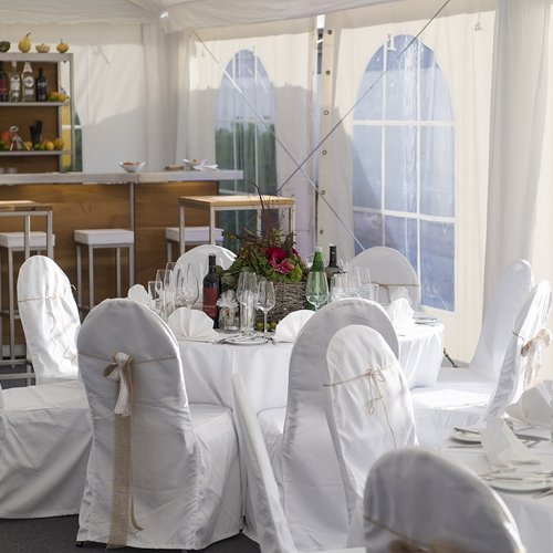 Wählen Sie einen Platz mitten im Grünen und gestalten Sie mit uns Ihr exklusives, weißes Hochzeitszelt nach Ihren Wünschen: Von der Einrichtung bis zur Dekoration. Auch bei der Wahl des Caterings oder einer speziellen Beleuchtung unterstützen wir Sie gerne.